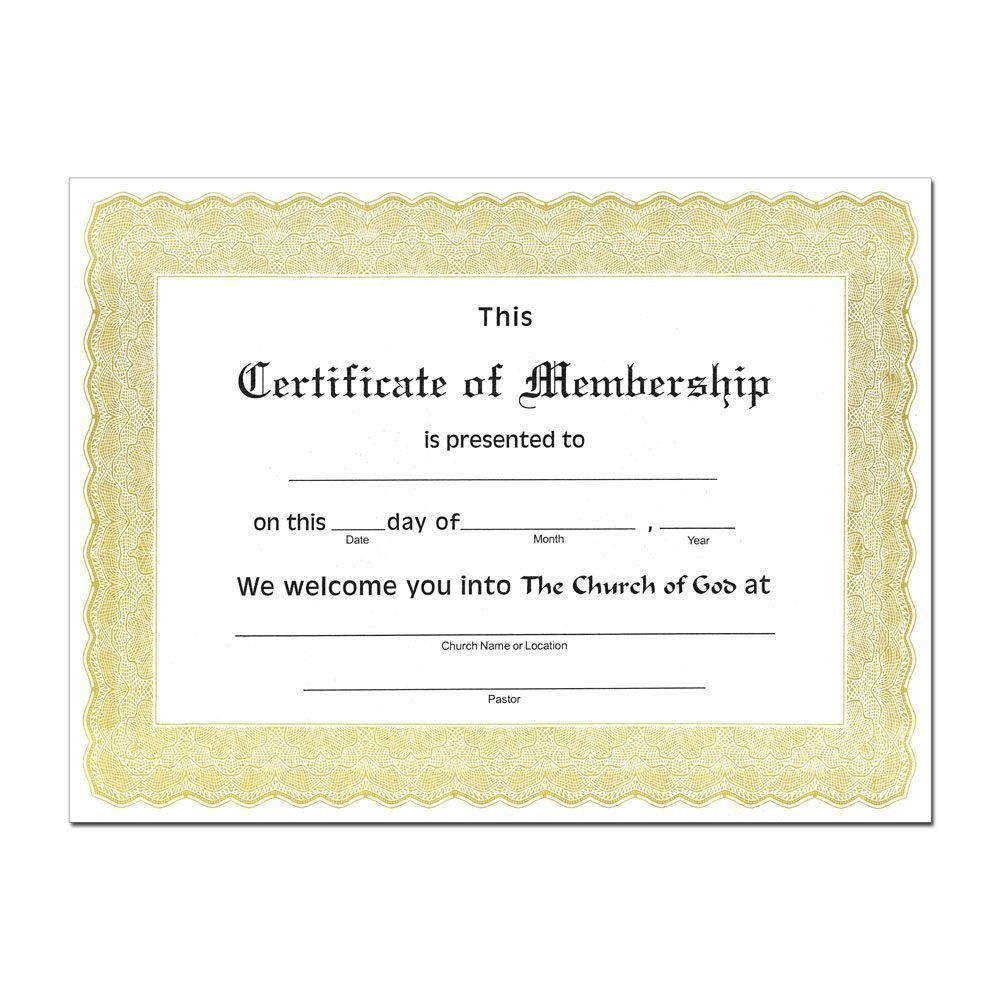 Y local church can give new members this 8 1/2" x 11" membership certificate. It is white with a golden border. The certificate includes lines for the individual's name, church location, date, and minister's signature.
